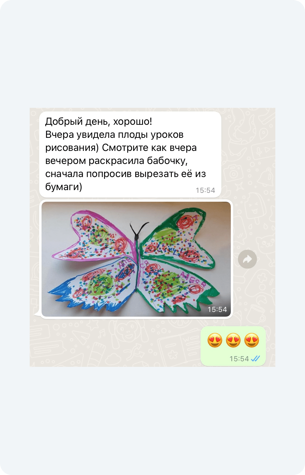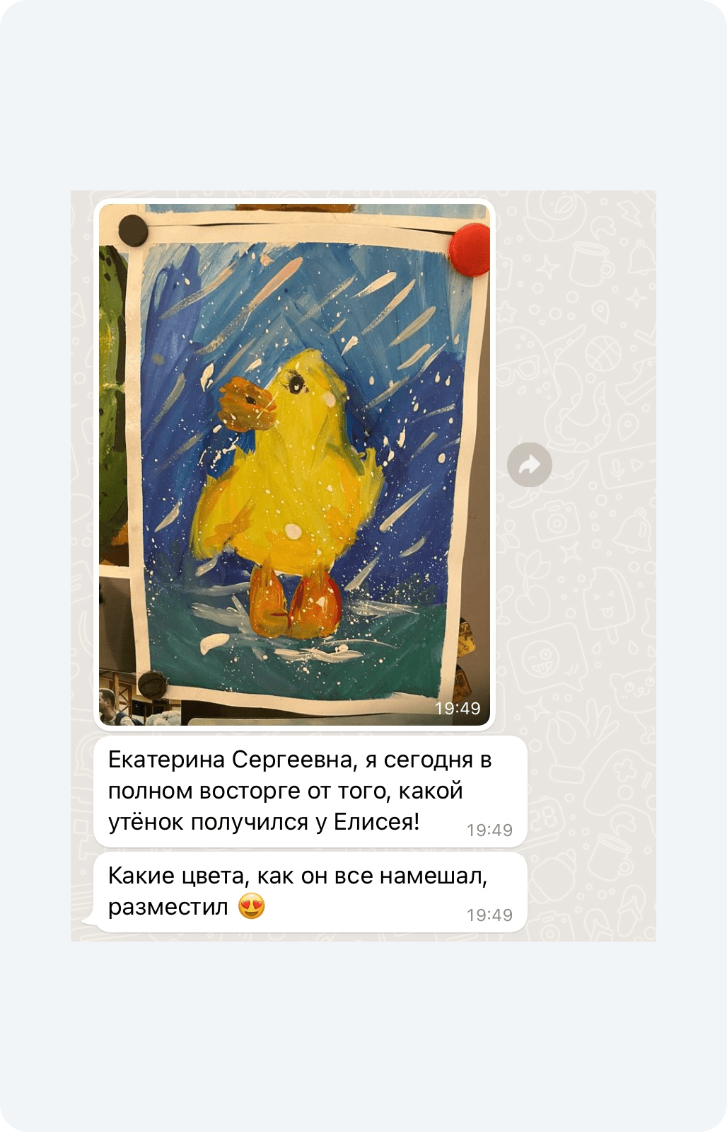На занятиях дети осваивают разные техники: гуашь, пастель, карандаш, акварель, маркеры. Учатся владению рукой, базовым основам рисования, развивают усидчивость и аккуратность. Мы не ограничиваем фантазию детей, развиваем креативность. В своём творчестве малыши также используют необычные способы рисования и различные материалы для поделок