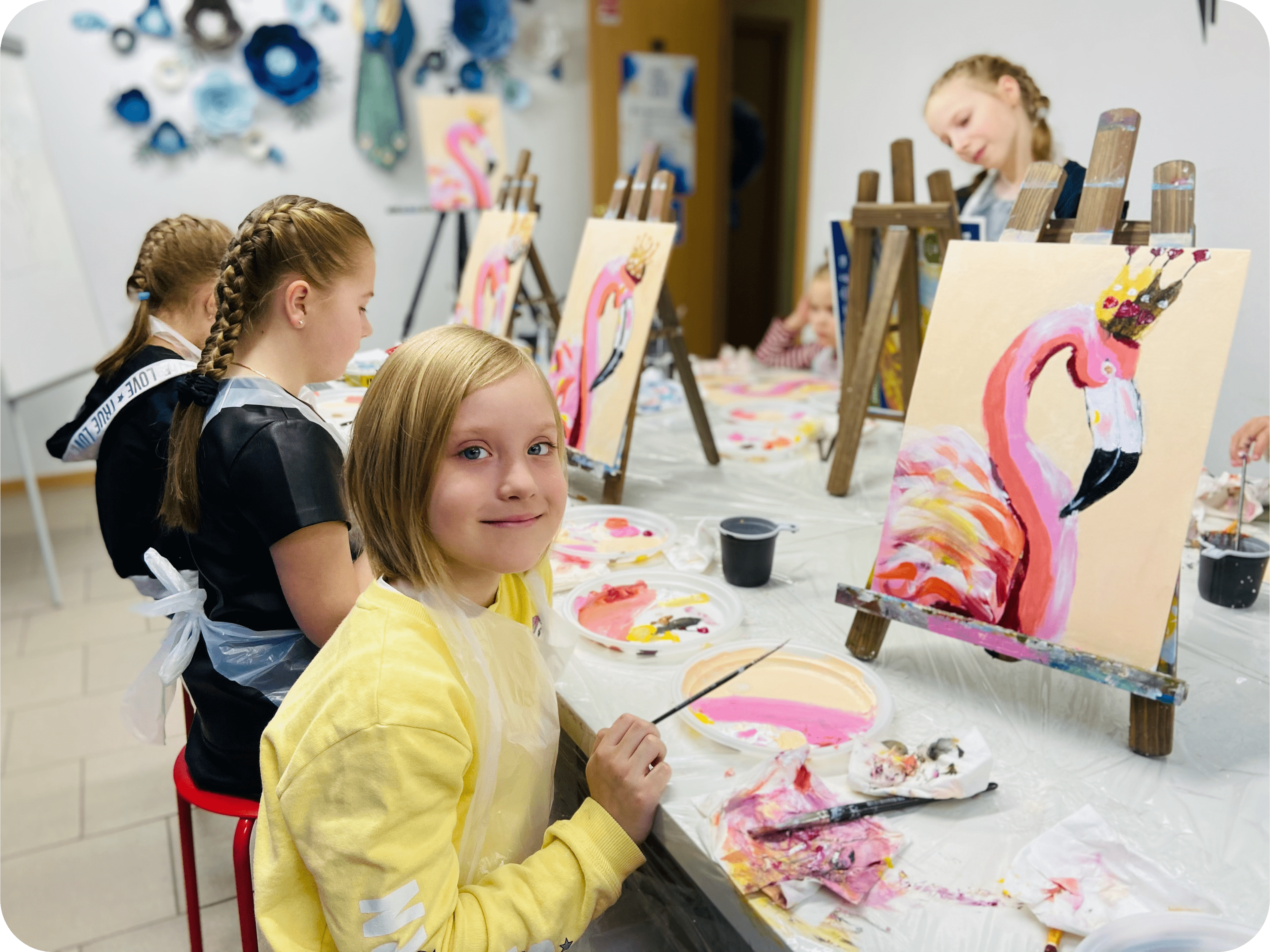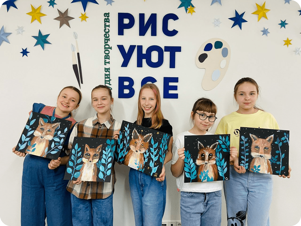 По выходным с нашей студии проходят мастер-классы по живописи акрилом на холсте. Принять участие в МК могут все желающие. Занятия построены таким образом, что даже у новичков получаются настоящие картины. Мы предоставляем все материалы для МК. Анонсы на ближайшие МК размещаем в наших социальных сетях. Выбирайте понравившийся сюжет, записывайтесь и приходите. Дети проводят два часа за холстом с перерывом на чаепитие, и уходят из нашей студии всегда довольные со своей собственной картиной на холсте. Такая картина будет очень тёплым и душевным подарком для бабушки, дедушки, крестных и других близких людей